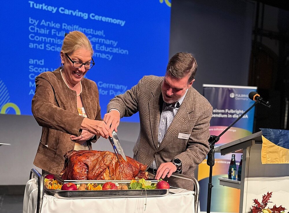 A cherished tradition of the event–the Turkey Carving Ceremony–was led by Fulbright Germany Board Chair, Anke Reiffenstuel and Co-Chair, Scott Weinhold, each offering warm words of welcome. The ceremony symbolized gratitude, togetherness, and the longstanding cultural ties that bring our German-American community together each year.